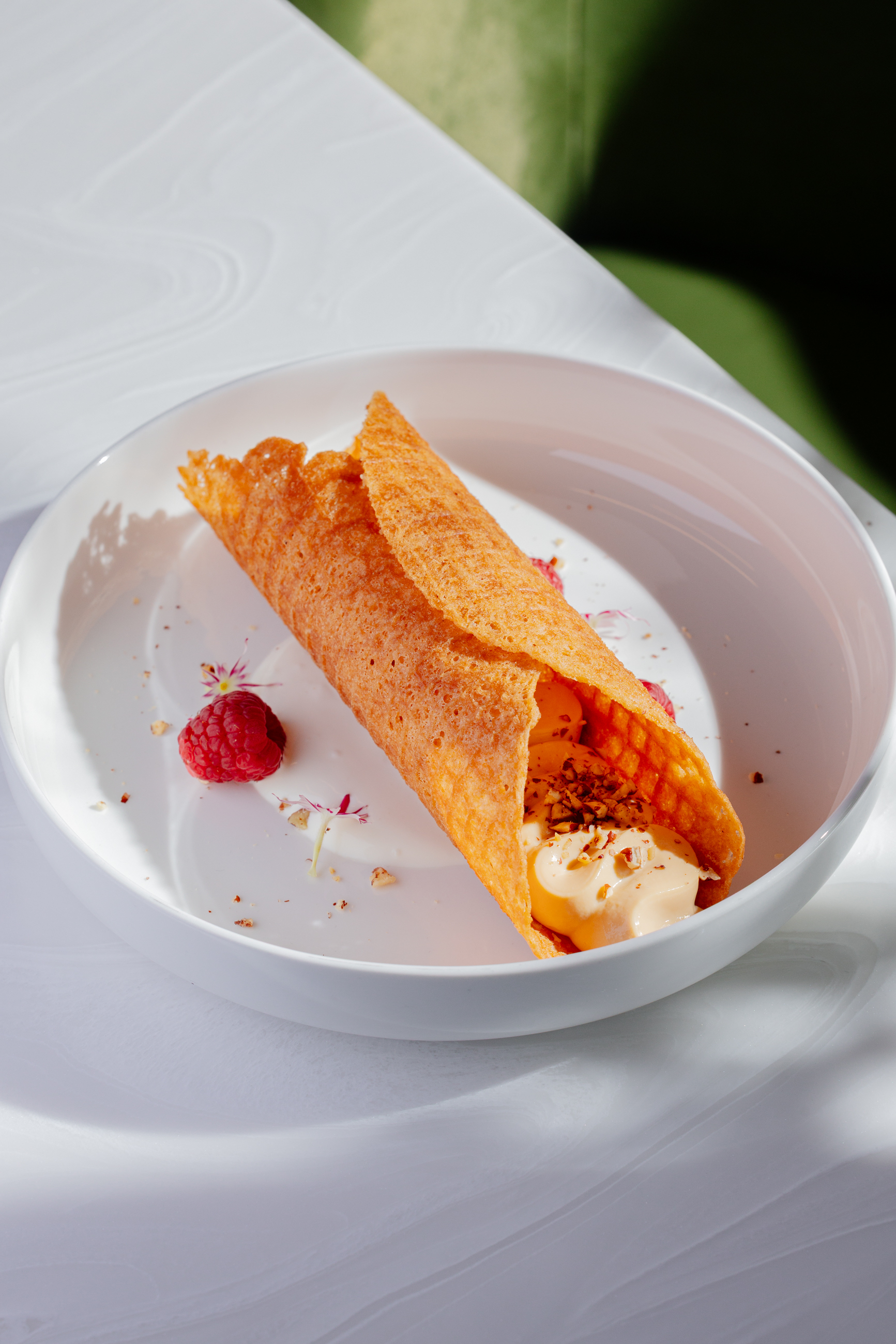 А на десерт — сливочный саварен с яблоками и пломбиром или хрустящую вафельную трубочку с пралине, начинённую кремом из варёной сгущенки.